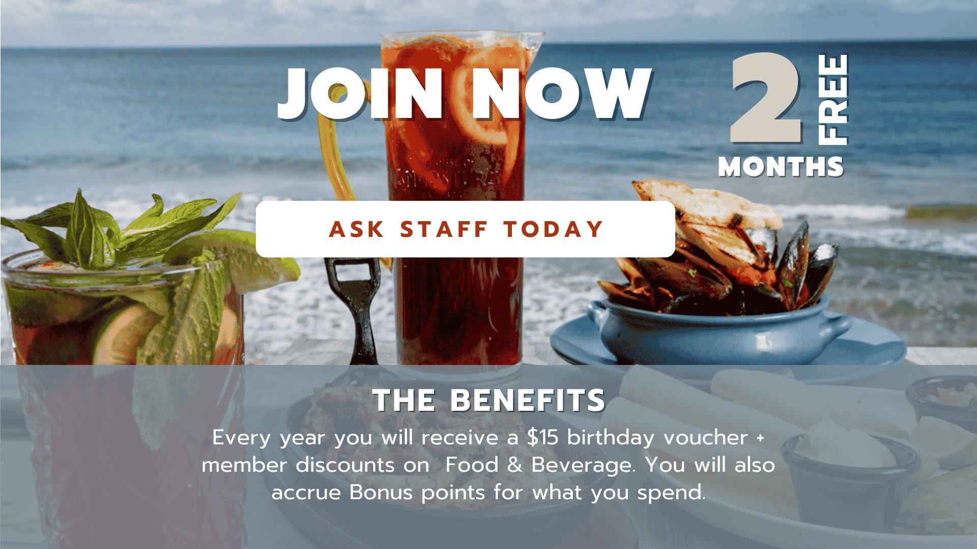 Why not join up to your local club? Save money on every purchase at the bar or restaurant, $15 Voucher on your birthday & the amazing view overlooking Collaroy Beach. Join in February & get 2 months extra for free.