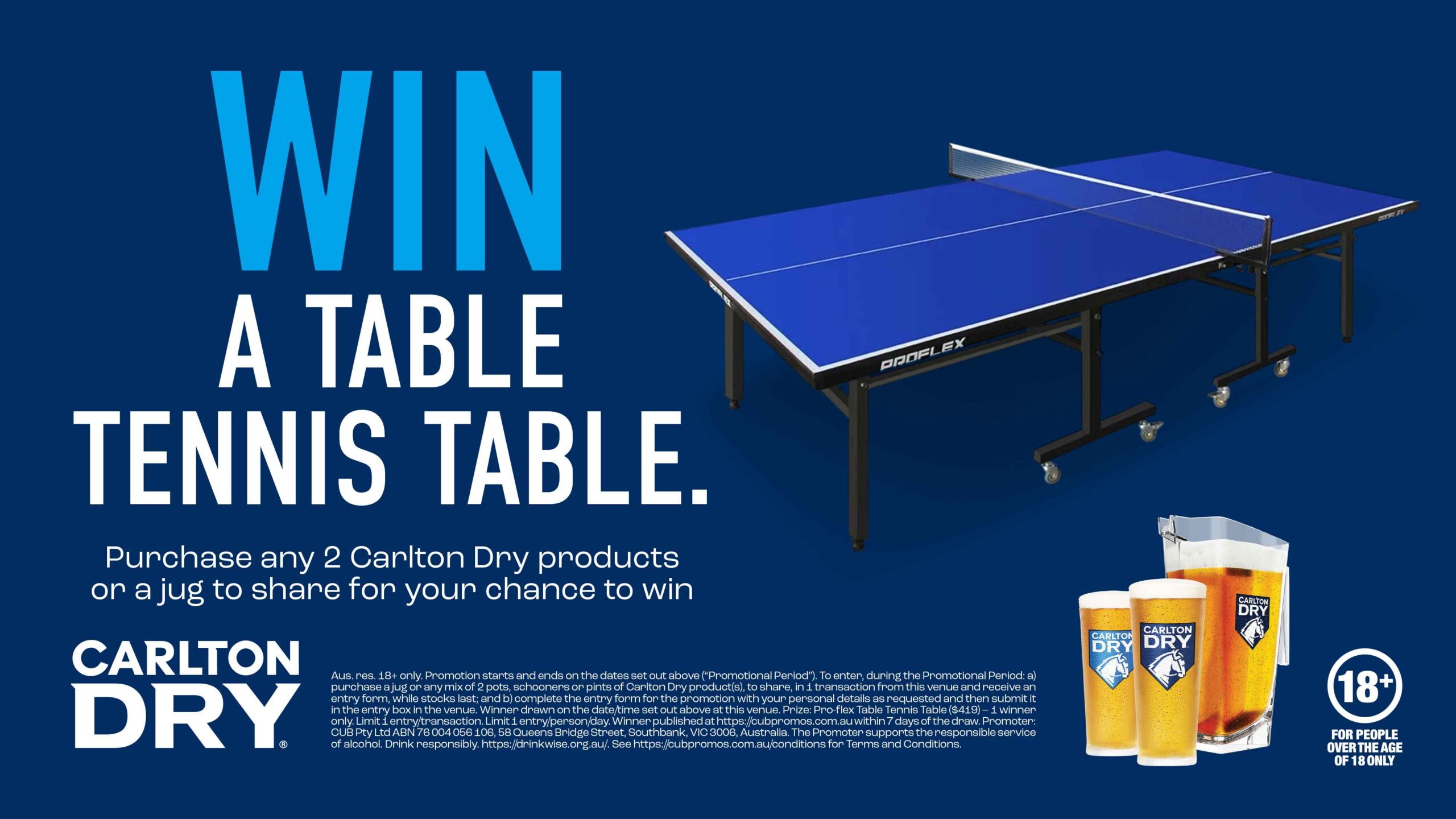 Joining our massive range of tap beers in February is Carlton Dry. Grab 2 Dry’s for your chance to win a Ping Pong table. Perfect for fun & games at home.